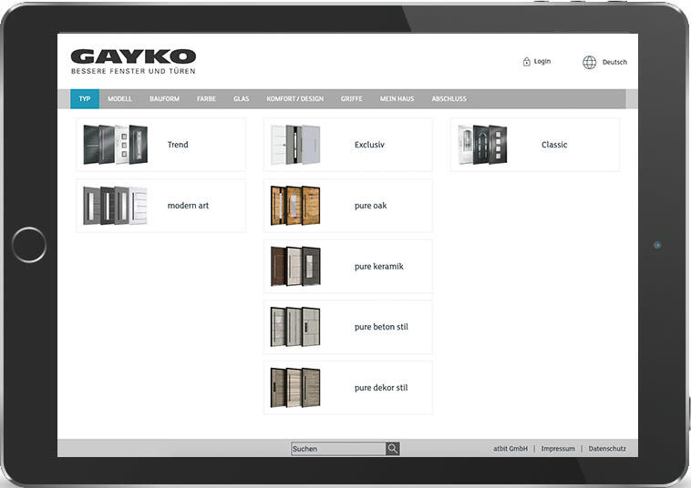 Design your entrance door exactly as you wish. With the GAYKO front door configurator, you can easily configure your dream door from home and test out all the options. To do this, select the model and design online and decide on the color, glass, handle and other accessories. In just a few minutes, you will have an almost photorealistic image of your new door. Our consultants will of course be happy to provide you with advice and assistance.